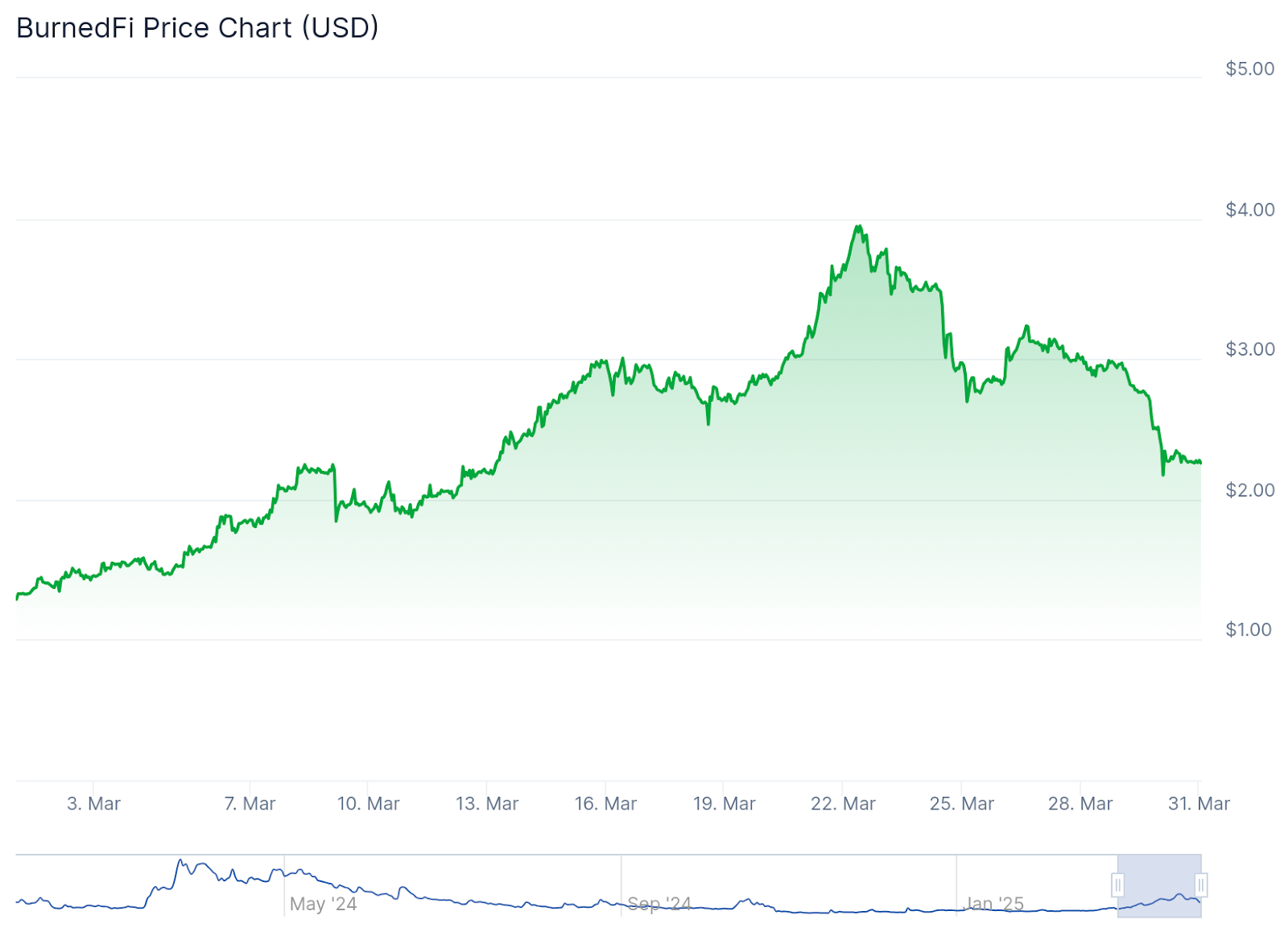 बर्नडफाई (BURN) ने मार्च में एक मजबूत रैली का अनुभव किया, जो $1.28 (1 मार्च) से बढ़कर $3.75 (23 मार्च) के शिखर पर पहुंच गया, और फिर वापस $2.46 (30 मार्च) पर आ गया। यह 94.5% की बढ़त संभवतः बाजार में बढ़ती दिलचस्पी, सट्टा व्यापार और महीने के मध्य में मजबूत मात्रा में उछाल के कारण हुई।