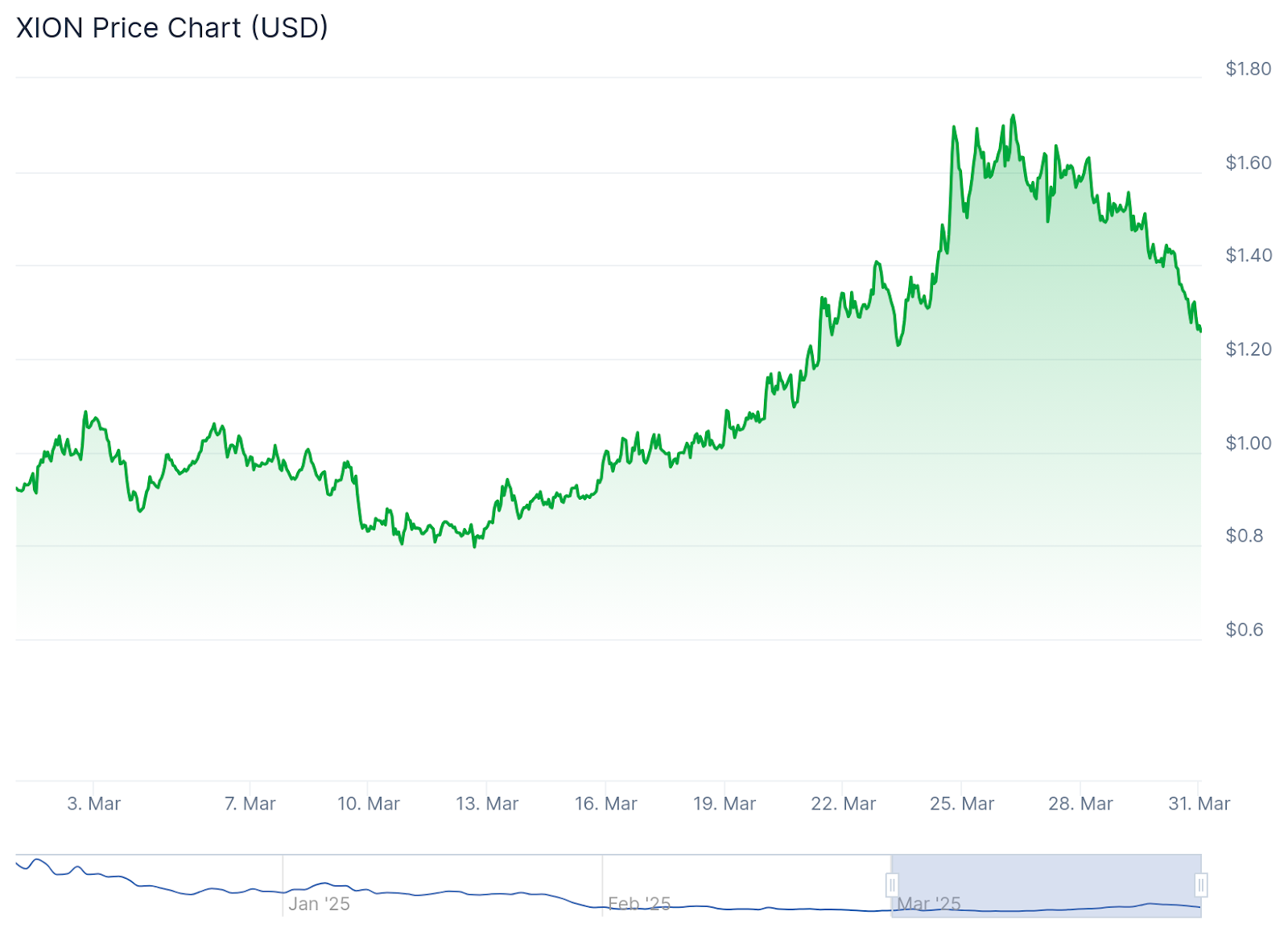 XION USD ने मार्च में एक मजबूत रैली की, जो $0.9228 (1 मार्च) से $1.41 (30 मार्च) तक +52.8% बढ़ गई। बाजार पूंजीकरण में उतार-चढ़ाव आया, लेकिन सबसे बड़ा उछाल मार्च के अंतिम सप्ताह में आया, जब यह $1.17 (21 मार्च) से बढ़कर $1.71 (26 मार्च) हो गया, जो केवल पांच दिनों में 46% की वृद्धि दर्शाता है।