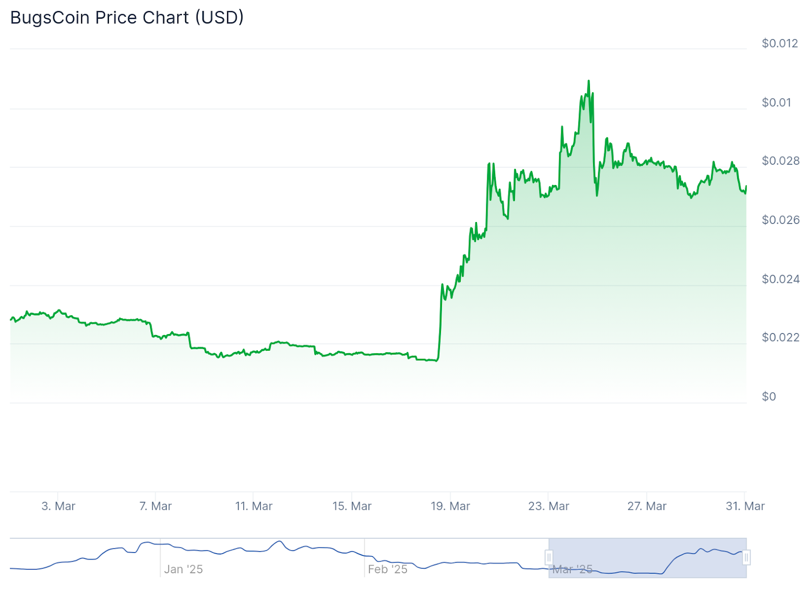 BugsCoin USD का मूल्य तेजी से बढ़ा, जो $0.00281 (1 मार्च) से बढ़कर $0.00788 (30 मार्च) हो गया। महीने के मध्य में कीमत और ट्रेडिंग वॉल्यूम दोनों में उल्लेखनीय वृद्धि के साथ, बाज़ार पूंजीकरण $17 मिलियन से बढ़कर लगभग $49 मिलियन हो गया। 25 मार्च को भारी ट्रेडिंग वॉल्यूम ($37 मिलियन) ने कीमत को $0.0078 से $0.00856 तक पहुँचाया और 24 मार्च को मामूली गिरावट से पहले $0.00878 के शिखर पर पहुँच गया।