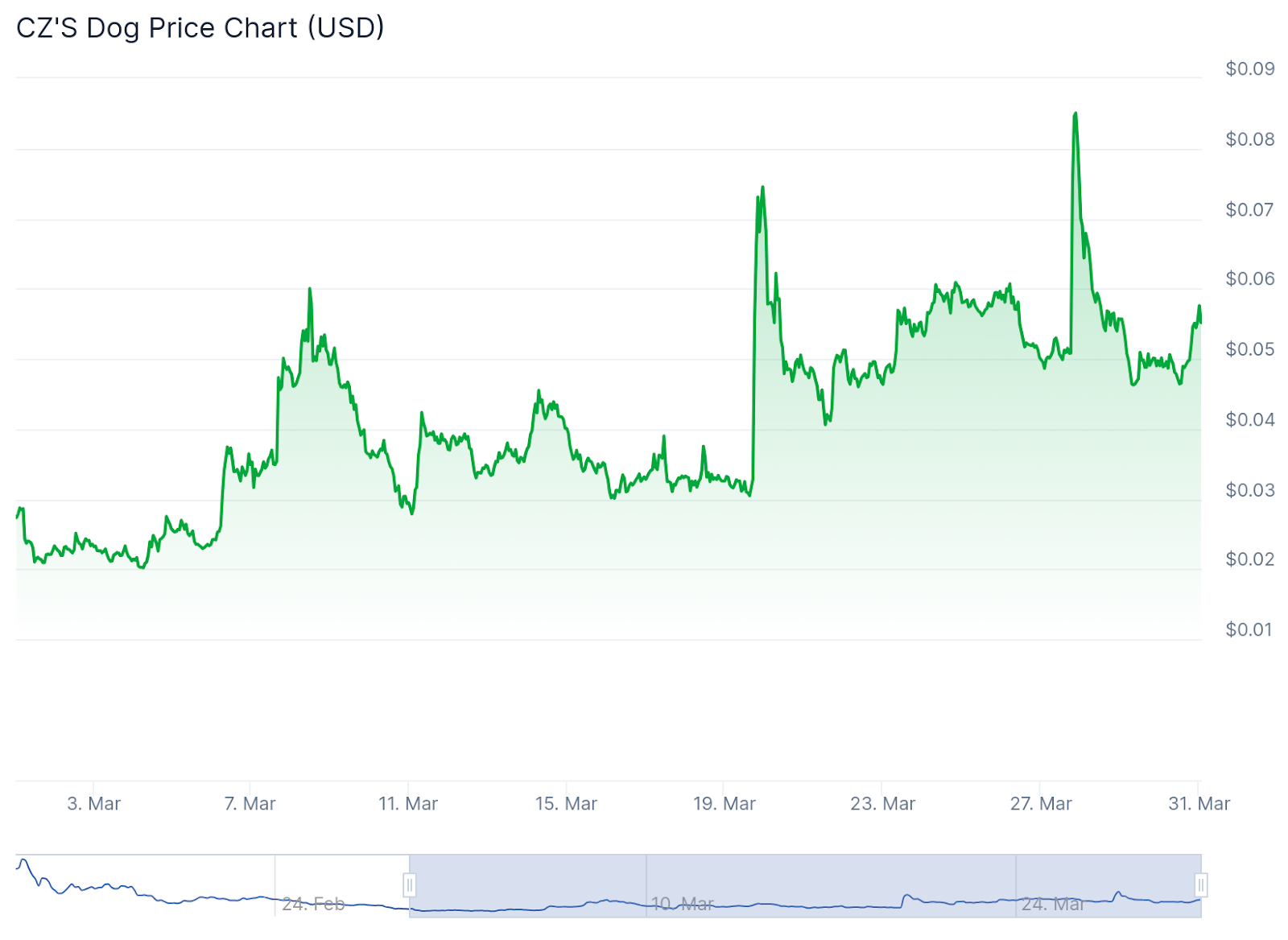 सीज़ेड के डॉग यूएसडी में उतार-चढ़ाव भरा लेकिन मज़बूत अपट्रेंड रहा, जिसकी कीमतें $0.0273 (1 मार्च) से बढ़कर $0.0687 (28 मार्च) के शिखर पर पहुँचीं, और फिर $0.0499 (30 मार्च) तक गिर गईं। बाज़ार पूंजीकरण में उल्लेखनीय वृद्धि हुई, जो $68 मिलियन के शिखर पर पहुँचकर $49 मिलियन पर वापस आ गया। 19 मार्च को एक महत्वपूर्ण ब्रेकआउट हुआ, जिसमें $0.033 से $0.068 तक की छलांग देखी गई, जो एक दिन में दोगुने से भी अधिक थी।