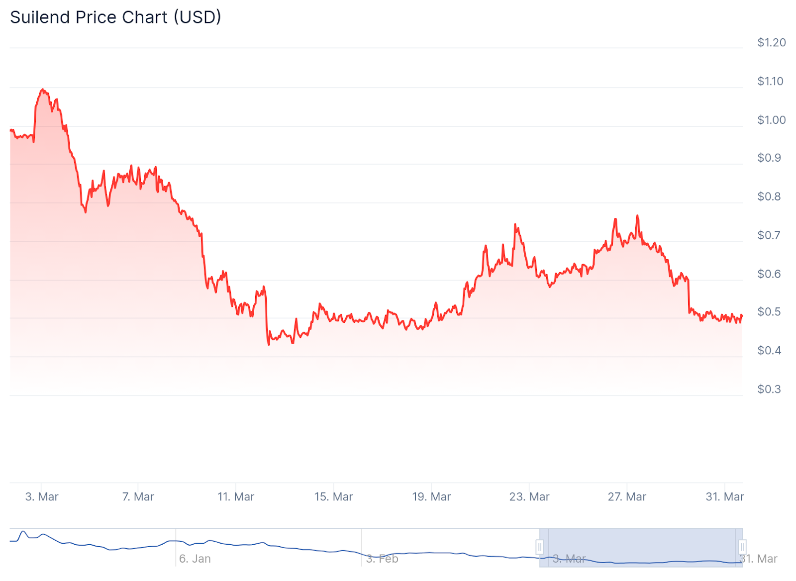 सुइलेंड ने पूरे मार्च में तेज गिरावट का अनुभव किया; इसकी कीमत 1 मार्च को $1.005 से गिरकर 30 मार्च को $0.502 हो गई, जो महीने भर में 50.05% की उल्लेखनीय गिरावट को दर्शाता है। 2 मार्च को कीमत कुछ समय के लिए $1.089 के उच्चतम स्तर पर पहुँची, फिर एक स्थिर गिरावट दर्ज की गई, जिसमें सबसे उल्लेखनीय एक-दिवसीय गिरावट 11 मार्च और 12 मार्च के बीच हुई, जब यह $0.5699 से गिरकर $0.4559 हो गई, यानी 19.99% की गिरावट।