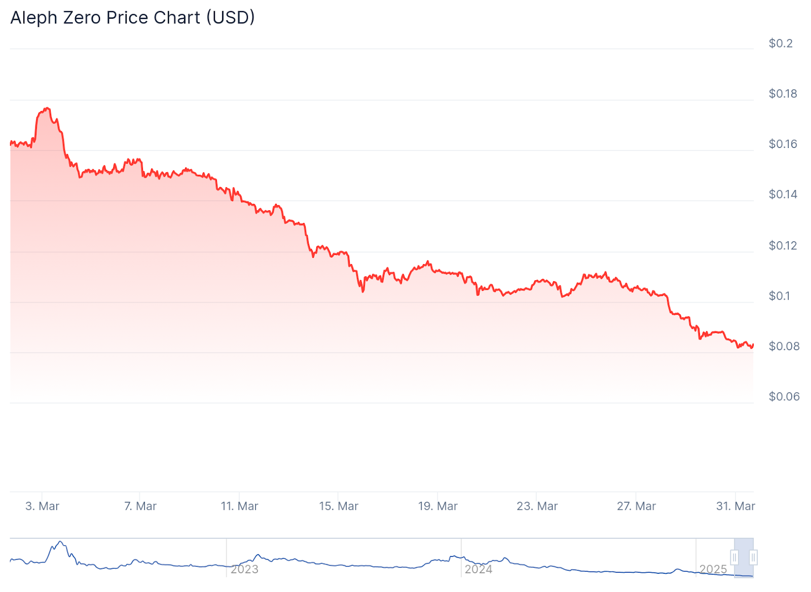 एलेफ ज़ीरो (AZERO) ने पूरे मार्च में एक लंबी गिरावट का अनुभव किया, इसकी कीमत 1 मार्च को $0.1618 से गिरकर 31 मार्च को $0.0832 हो गई। इसका बाजार पूंजीकरण भी 48.5% घटकर $48.9M से $25.18M हो गया।