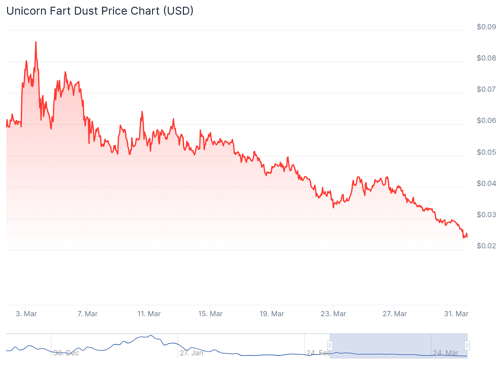 यूनिकॉर्न फार्ट डस्ट (UFD) की कीमत में पूरे मार्च में उल्लेखनीय गिरावट देखी गई, जो 1 मार्च को $0.0636 से गिरकर 31 मार्च को $0.0283 हो गई। मार्च के पहले पखवाड़े में कीमतों में उल्लेखनीय उतार-चढ़ाव देखा गया, जिसमें 2-3 मार्च को $0.0794 का उच्चतम स्तर और उसके बाद एक पुनरावृत्ति शामिल है। महीने के दूसरे पखवाड़े में, क्रमिक रूप से निम्नतम उच्च और निम्न स्तरों के साथ, अंतिम दो हफ़्तों के दौरान लगभग 50% की गिरावट दर्ज की गई।