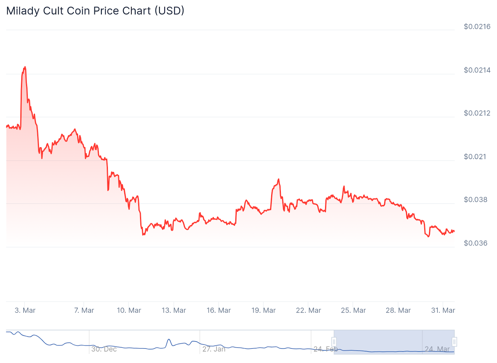 Milady Cult Coin (LADYS) ने मार्च 2025 में एक महत्वपूर्ण गिरावट का अनुभव किया, जो 1 मार्च को $0.00114927 से गिरकर 31 मार्च को $0.00065890 हो गया। बाजार पूंजीकरण भी 46.7% घटकर $53.11M से $28.32M हो गया। काफी सुसंगत व्यापारिक मात्रा के बावजूद, यह आगे की कीमत में गिरावट को रोकने के लिए अपर्याप्त था। सबसे अधिक मात्रा में उछाल 1 मार्च को ($2.19M) हुआ, उसके बाद 9 मार्च को ($1.72M) एक और शिखर पर पहुंचा, दोनों ही कीमतों में गिरावट के साथ हुए, जो बढ़ी हुई बिकवाली का संकेत देते हैं।
